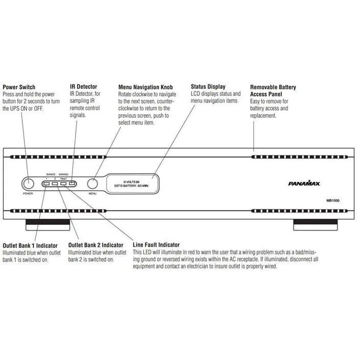 In the event of a loss of power to the unit, over-voltage, or under-voltage, the MB1000 will function as a battery back-up. An audible alarm will sound and the display will indicate the fault as well as the number of minutes of battery life remaining.