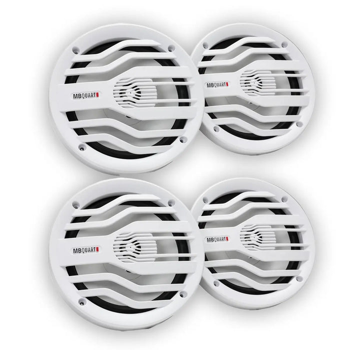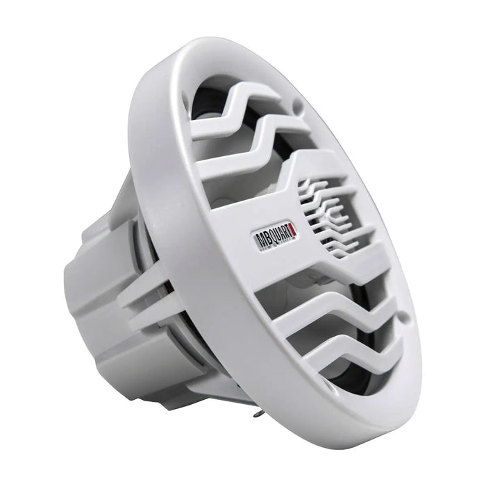 MB Quart NK2-116W premium 6.5-inch coaxial speaker for boat, RV and off-road vehicle audio installations. The speakers feature water-resistant midrange cones, titanium tweeters, and rust-resistant connectors. Sold in pairs with grills in white.